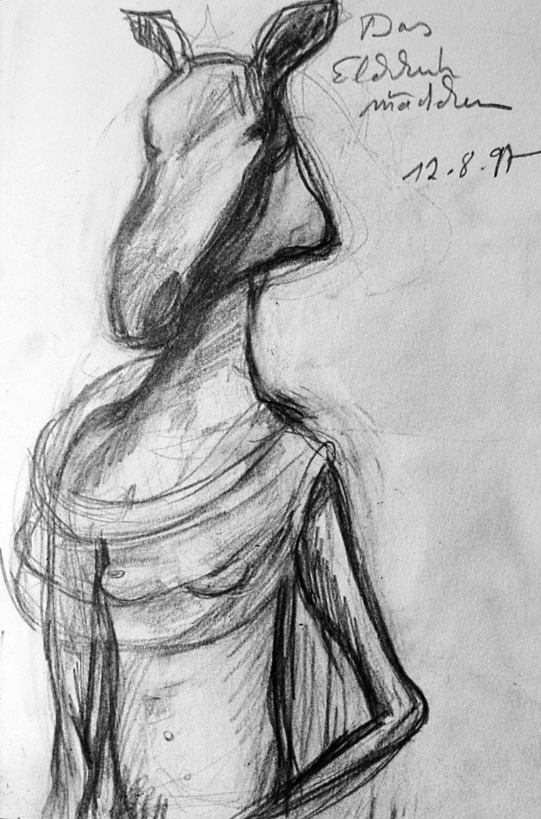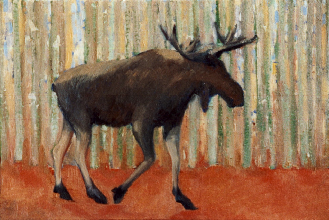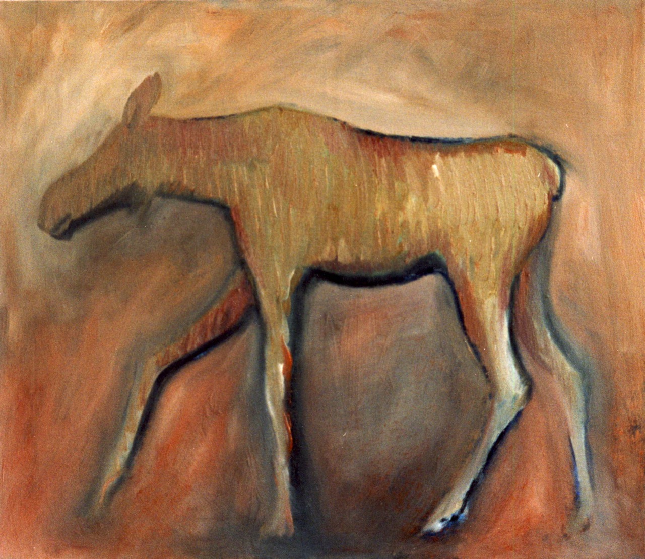 Vor meinem inneren Auge ließ ich eine Elchkuh an meine Tür klopfen und eintreten. Sie begleitete den Themenwechsel in meiner Malerei über mehrere Monate. Ich stellte mir vor, dass sie in dem langen Flur meiner Berliner Altbauwohnung Futter fand und wie sie mit dem Kopf zur offnenen Balkontür hinaus schlief. Jede Nacht träumten wir zusammen von der Taiga. Sie zeigte mir wie sie in den Sommern das Suhlen in den Sümpfen liebte und wie sie sich in den Wintermonaten so gerne im tiefen Schnee eingrub.