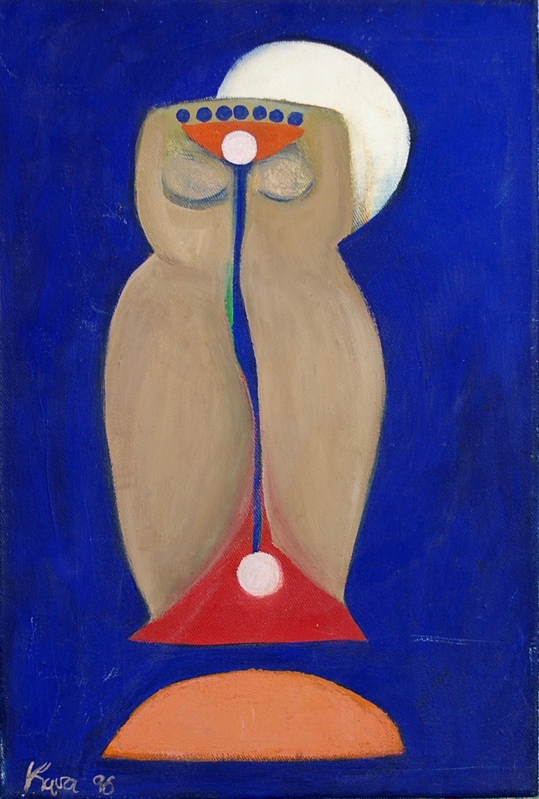 Die Schamanin sah in der blauen Linie mit ihrer Verschiebung im Bauchraum den Ausdruck von gebrochener Kraft. Daraufhin hatte ich das Bedürfnis diese Linie in einer Vollständigkeit zu malen. Dazu wählte ich eine Eule. Bezogen auf die ihr zugeordnete Eigenschaft der Weisheit, hatte ich die Vorstellung, dass sie über ein inneres Lot der Intuition verfügte. Es erschien mir wie ein Werkzeug des Geistes oder der Seele zu sein, eine innere Kraft oder Licht, die es ermöglichte sich im unbewussten Raum zu orientieren.