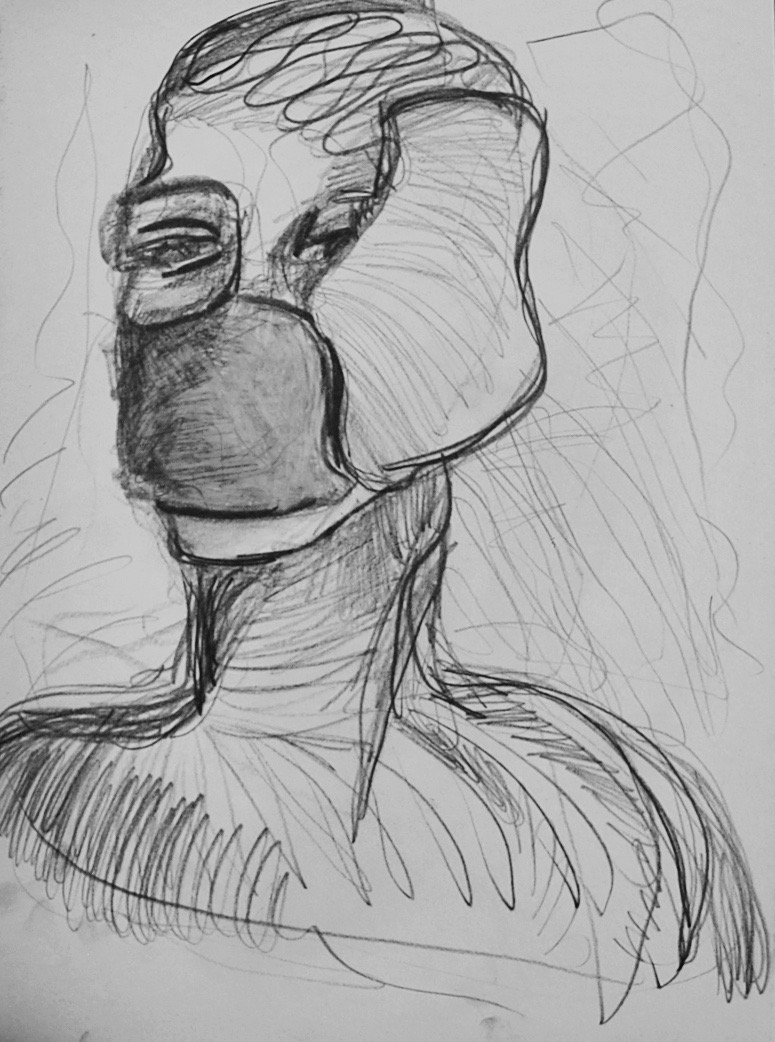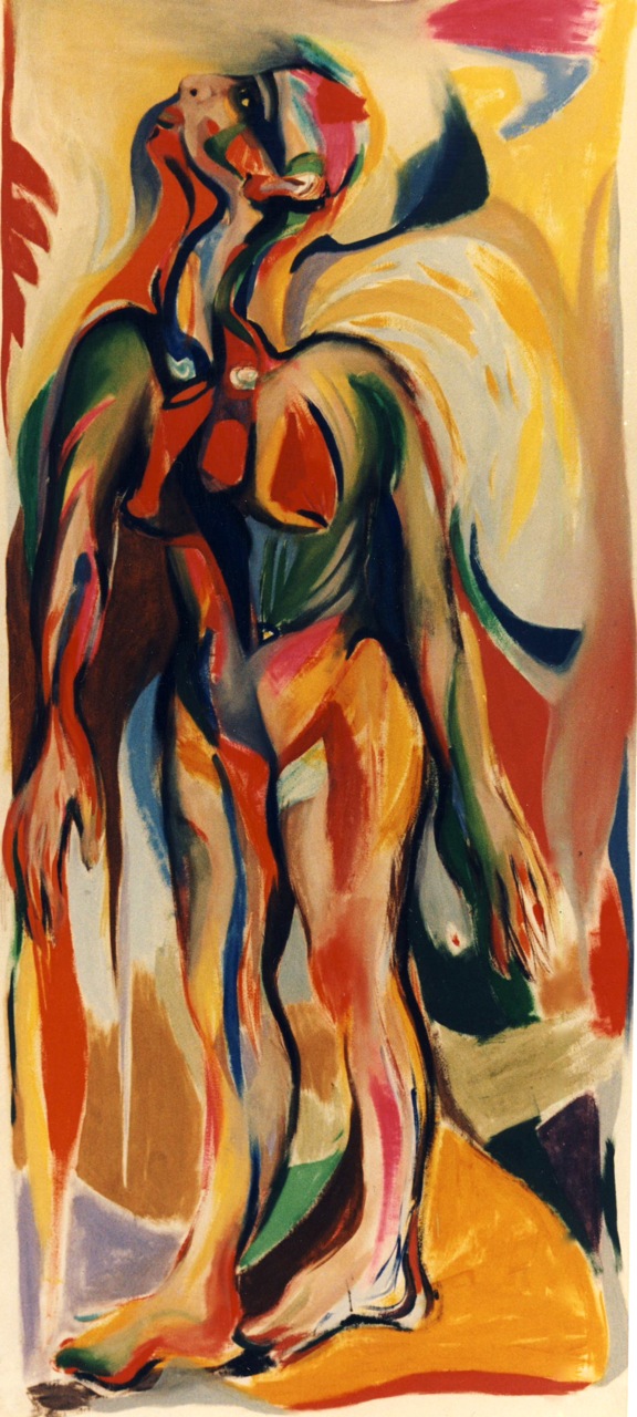 Ein nächster Schritt für den Themenwechsel stand in Zusammenhang mit dem 1996 entstandenen Ganzkörper-Selbstbildnis. Während meiner Mediationsretreats waren wiederholt innere Bilder und Gefühle von Ohnmacht und Tod in mir aufgestiegen. Mein Mediationslehrer lehnte eine bewusste inhaltliche Auseinandersetzung mit diesen Inhalten ab. Solche Eindrücke sollten wir so vorüberziehen lassen, wie auch unsere Gedanken. Damals lernte ich in Berlin eine moderne Stadtschamanin kennen. Sie machte mich neugierig auf ihre Arbeit, da sie unbewältigte Erfahrungen aus früheren Leben als reale Mitspieler unserer Gegenwart verstand. Von ihr hatte ich die Aufgabe erhalten das Ganzkörper-Selbstbildnis zu malen.Ich wählte eine Leinwand in meiner Körpergrösse aus. Ich mischte verschiedene Farbtöne. Während des Farben Spürens und Malens schloss ich die Augen und begann mit Gelb. Farbe wahrnehmen und sie im gleichen Moment auf die Leinwand übertragen. Dabei überließ ich mich ganz meiner Intuition, sowohl in der Farbwahl, als auch in dem Aufbringen der Farbfelder und Linien.